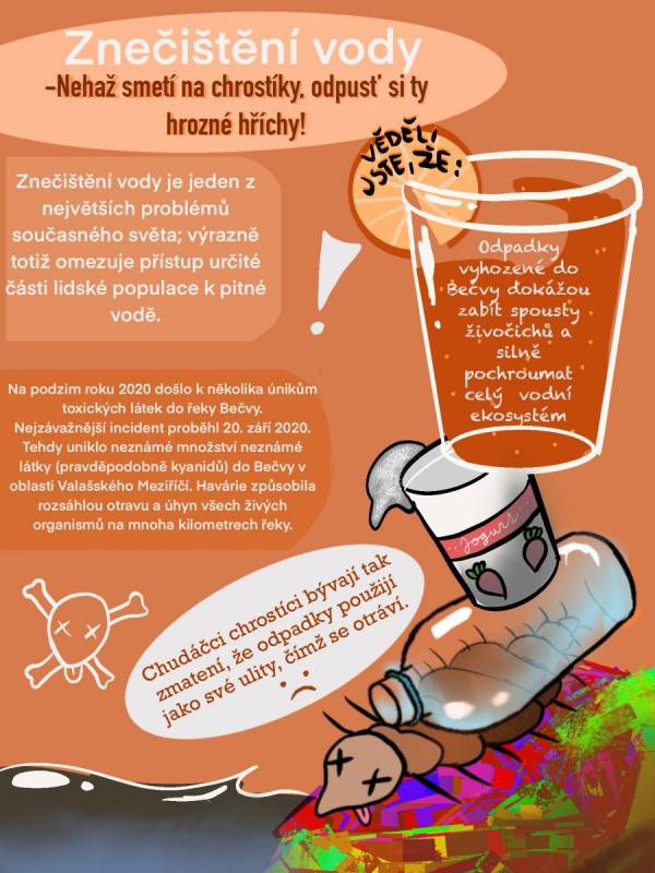 Třída 8. A se k Bečvě nad splavem na Ohradě ve školních časech pravidelně vrací a uklízí proti proudu, obvykle na jaře. Letos se rozhodla spojit úklid i s poukázáním na to, jak moc (téměř neviditelného) života Bečva ukrývá. Osmáci získali grant z Nadace Via a realizovali na trase Ohrada - Ústí několik stanovišť, která lehce a jednoduše upozorňují nejen na to, co v Bečvě lze nalézt, ale i na problémy, které způsobil nevhodný zásah člověka. Přichází i s řešením, jak jim čelit. A snaží se přitáhnout k Bečvě a její kráse i veřejnost.