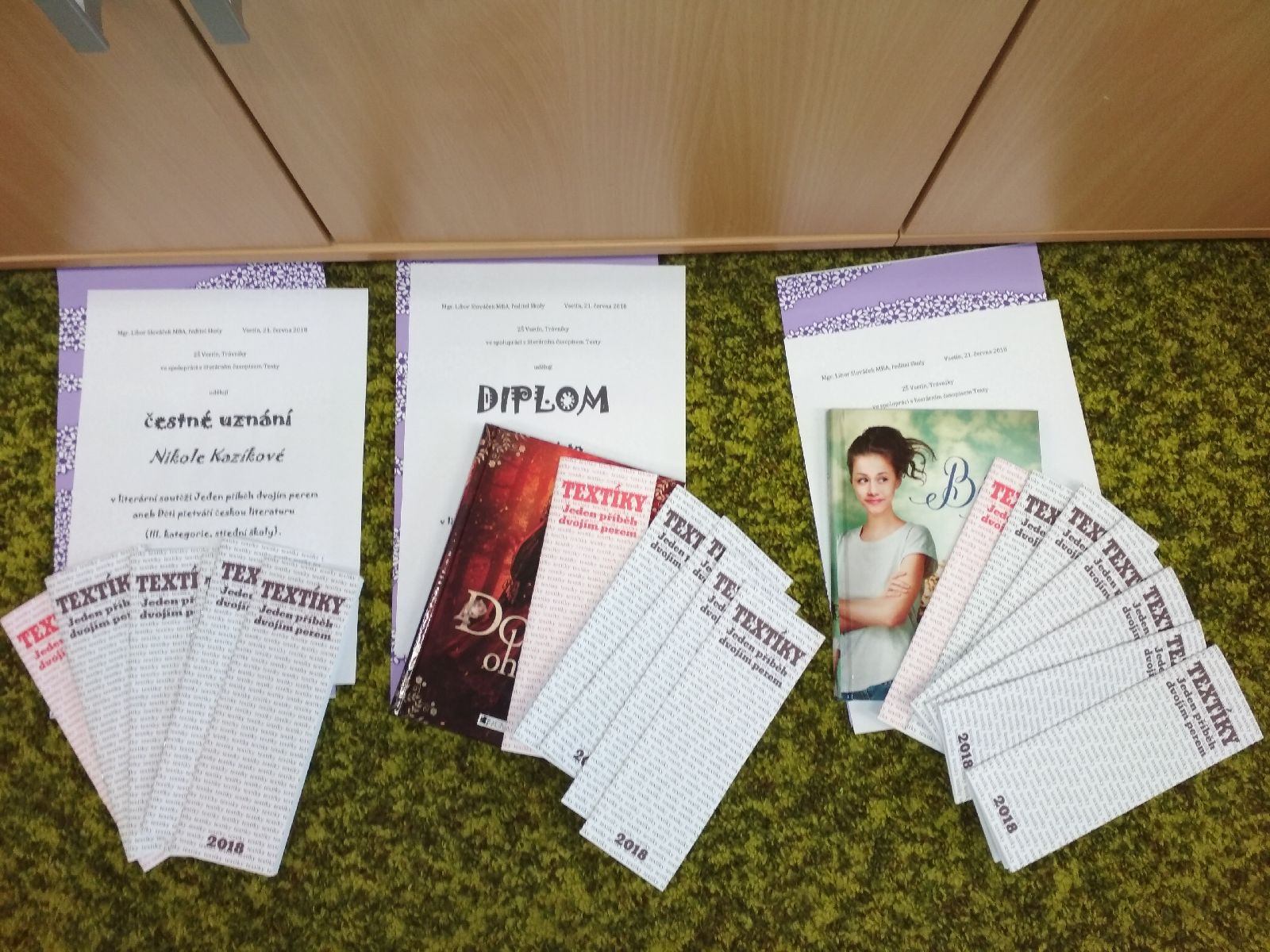 Každoroční literární soutěž Jeden příběh dvojím perem aneb Děti přetváří českou literaturu organizovaná naší školou ve spolupráci se vsetínským literárním časopisem Texty ve čtvrtek 21. června 2018 uveřejnila jména letošních vítězů. Slavnostní vyhodnocení se odehrávalo v dopoledních hodinách v prostorách naší školy a jeho součástí byl i workshop tvůrčího psaní pod vedením Lucie Strbačkové z Masarykovy veřejné knihovny ve Vsetíně. V porotě soutěže zasedli nakladatel a vydavatel PhDr. Dalibor Malina, literární kritik a šéfredaktor Textů Mgr. Pavel Kotrla a publicistka a učitelka českého jazyka Mgr. Andrea Chrobáková Lněničková, Ph. D.
