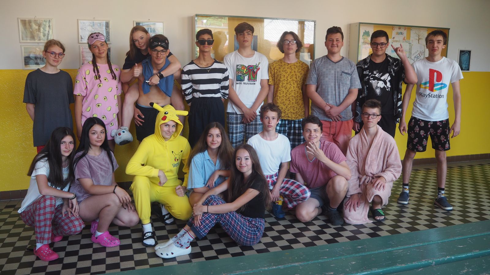 V pondělí 20. června se na naší škole na druhém stupni uskutečnil pyžamový den organizovaný žáky 9. A. V tento den předposledního školního týdne jste mohli na chodbách potkat nejrůznější modely, například si žáci vzali saténové noční košilky svých maminek, různobarevná pyžámka svých sourozenců, taky jste mohli narazit na pár chlapců v růžových plyšových županech, anebo na žáky v různých zvířecích overalech.