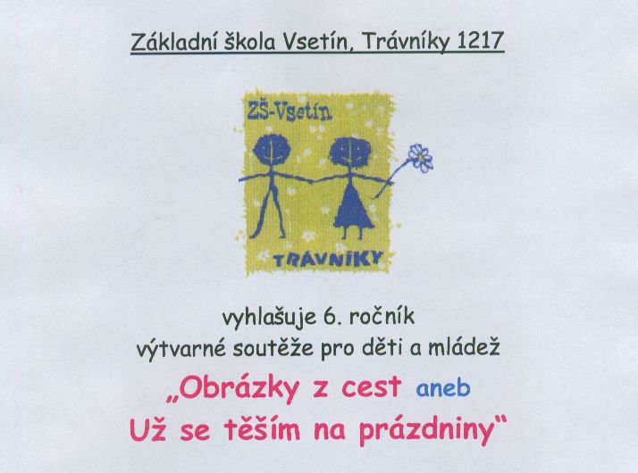 V letošním roce naše škola uspořádala již 6. roční výtvarné soutěže, tentokrát s názvem "OBRÁZKY Z CEST aneb UŽ SE TĚŠÍM NA PRÁZDNINY". Soutěže se zúčastnilo celkem 5 škol - pořádající ZŠ Vsetín, Trávníky, dále ZŠ Vsetín, Rokytnice, ZŠ Kateřinice a také dvě rožnovské školy - ZŠ Videčská a ZŠ Koryčanské paseky.
